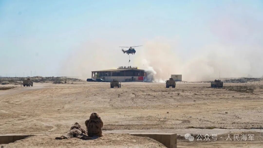▲中沙双方参训队员协同开展直升机滑降训练