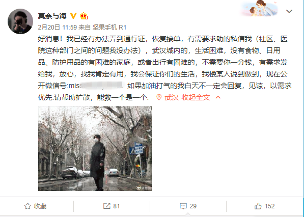 最近很少收到求助信息了。社區(qū)開始有限放行,市內(nèi)交通在逐步恢復(fù),各行各業(yè)也在陸續(xù)復(fù)工。這意味著,武漢已經(jīng)不太需要他這樣的志愿者了。